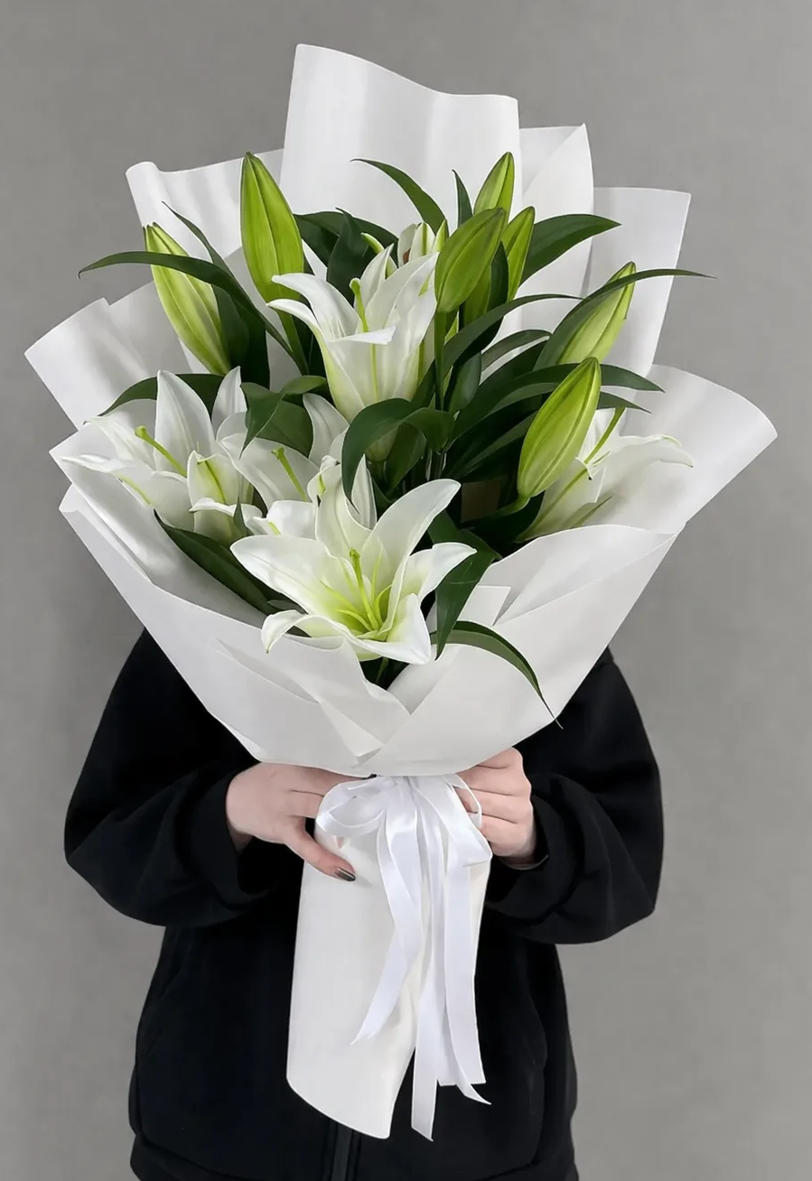 Нежные белые лилии создают утончённую и воздушную композицию с лёгким ароматом. Стильная упаковка подчёркивает природную красоту цветов, делая букет идеальным подарком для особого случая.