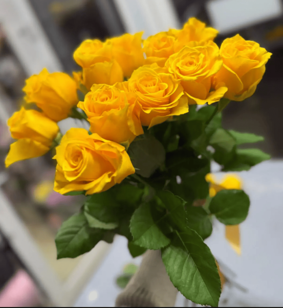 Букет жёлтых роз, аккуратно перевязанный атласной лентой, - это солнечное настроение, тепло и искренние эмоции в каждом лепестке. Яркие жёлтые бутоны символизируют радость, дружбу, уважение и заботу, наполняя любой момент светом и позитивом.