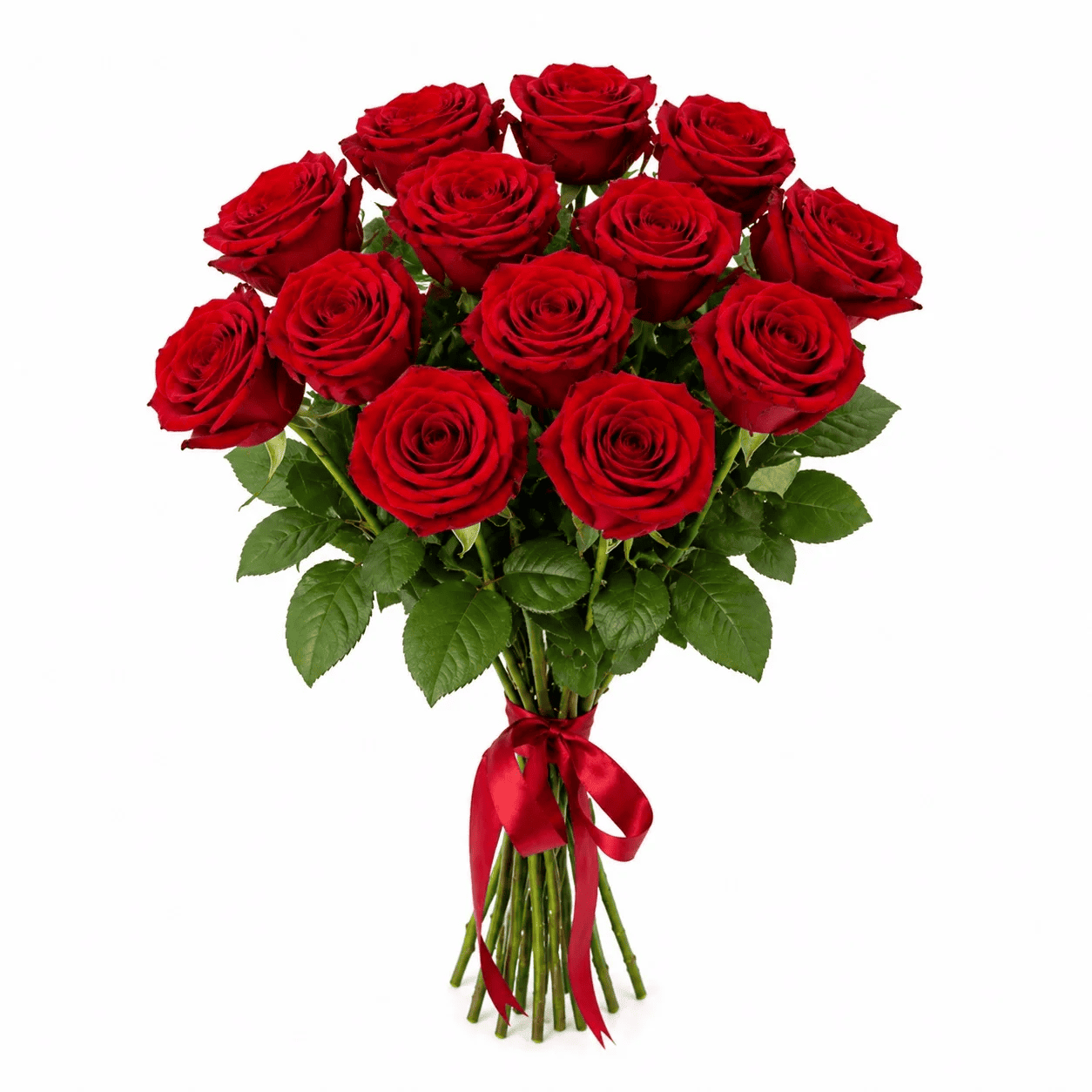 Букет из 13 красных роз под ленту - это выразительный и элегантный подарок, который символизирует глубокую любовь, страсть и искренние эмоции. Бархатные алые бутоны создают пышную, гармоничную композицию, которая притягивает взгляд и оставляет яркое впечатление.