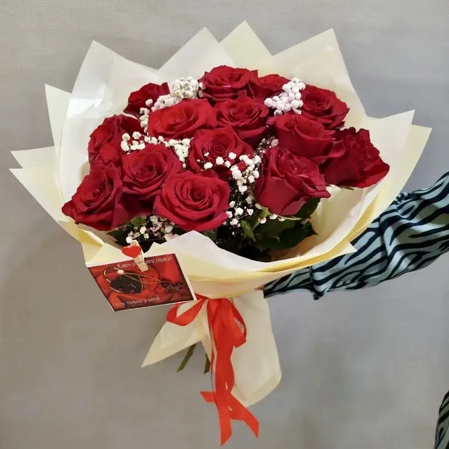 Эффектный букет из красных роз с гипсофилой в стильной упаковке - гармоничное сочетание страсти и воздушной нежности. Бархатистые бутоны насыщенного алого оттенка притягивают взгляд и символизируют глубокие чувства, а лёгкая, словно облако, гипсофила добавляет композиции объём, мягкость и утончённость. Контраст ярких роз и белоснежных мелких соцветий создаёт изысканный и романтичный образ. Стильная упаковка завершает композицию, делая её современным и запоминающимся подарком.