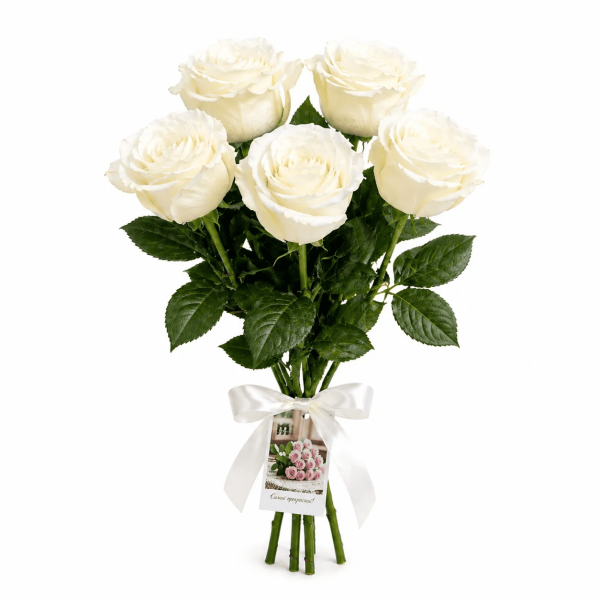 Элегантный букет из 5 белых роз - символ чистоты, искренности и утончённой красоты.