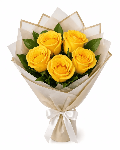 Букет из 5 жёлтых роз с рускусом - это яркая и жизнерадостная композиция, которая символизирует дружбу, радость и искренние пожелания счастья. Насыщенные жёлтые розы наполняют букет светом и позитивом, а зелень рускуса добавляет свежести, объёма и стильного природного акцента.
