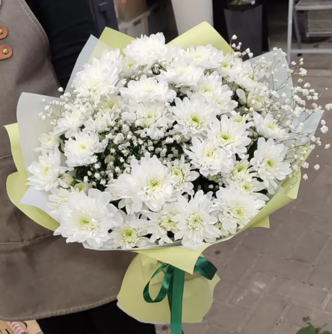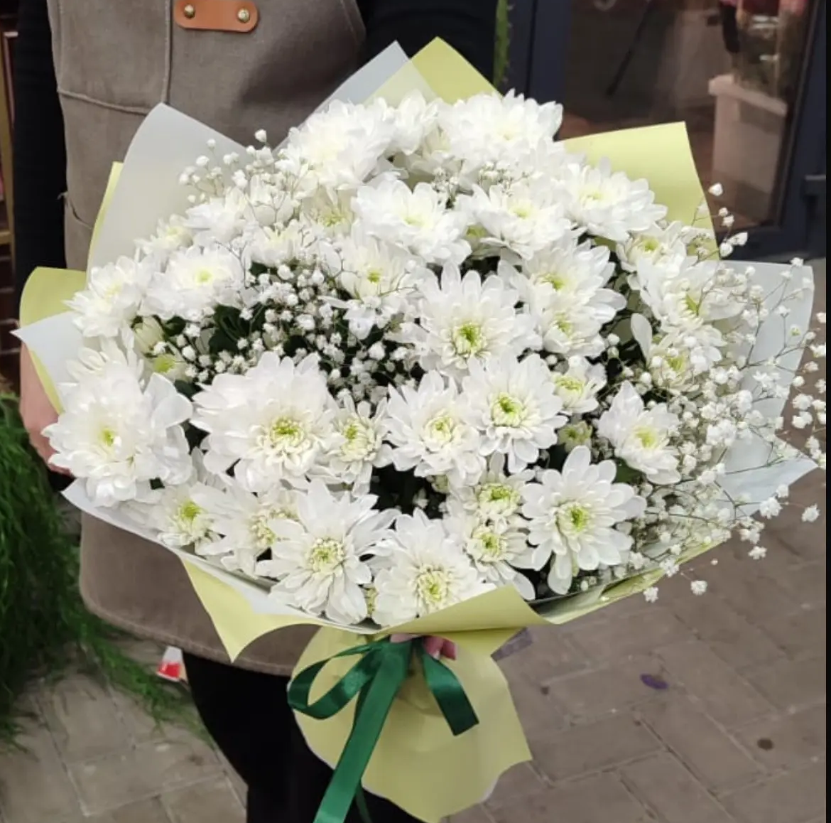 Нежный букет сочетает в себе белые хризантемы и гипсофилу, которые отлично гармонируют друг с другом .Цветы выражают нежность и заботу, чистоту намерений. Они универсальны, подойдут любимой девушке, коллеге и даже ребенку !