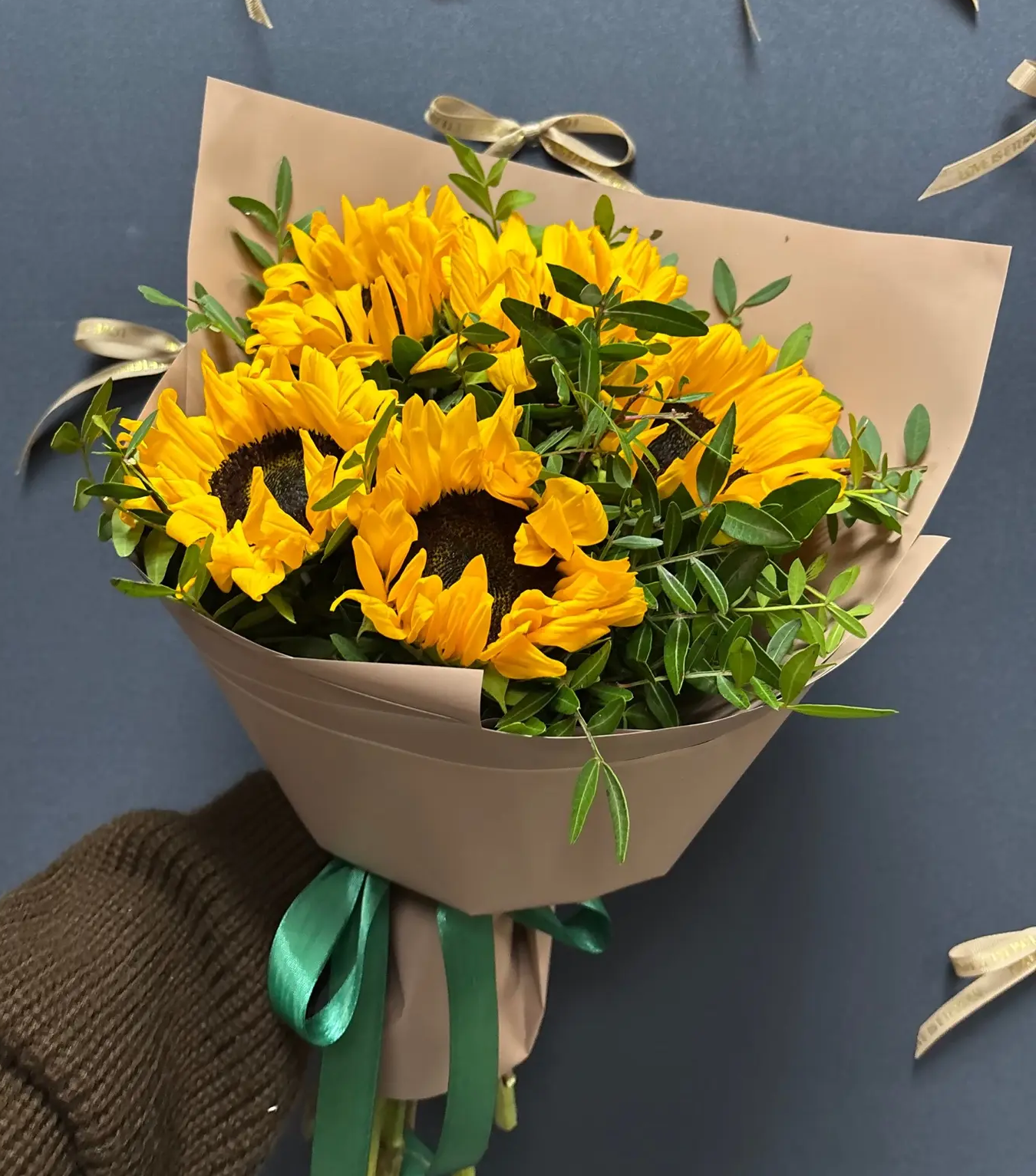 Подсолнухи,зелень,упаковка,лента