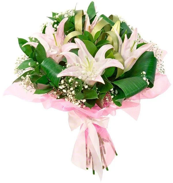 Вариант—Стандарт - лилия - 3 шт., гипсофила, зелень, упаковка, лента