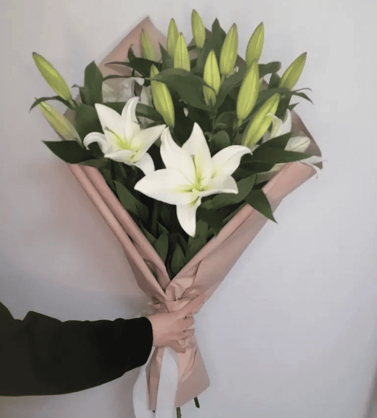 Элегантная упаковка подчёркивает природную красоту лилий и придаёт букету завершённый, стильный вид. Такой букет станет прекрасным подарком для важного события или душевного знака внимания без повода.