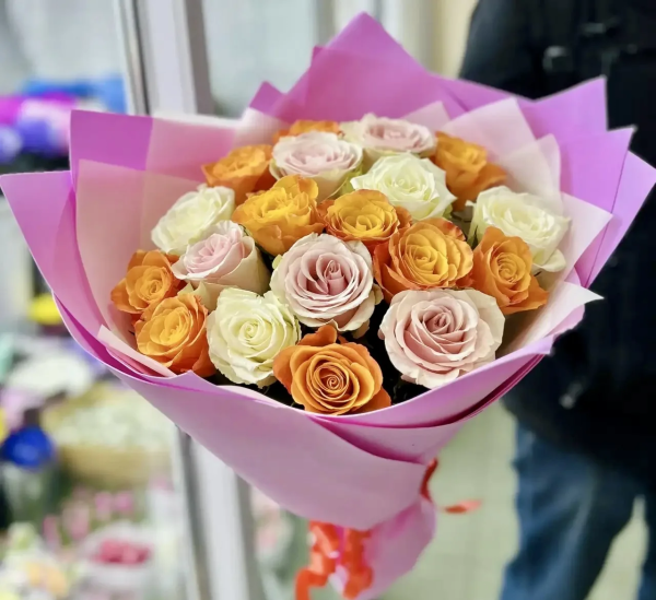 Аккуратная упаковка подчёркивает игру оттенков и придаёт букету завершённый, подарочный вид. Такой букет идеально подойдёт для дня рождения, поздравления, благодарности или просто как способ поднять настроение близкому человеку.