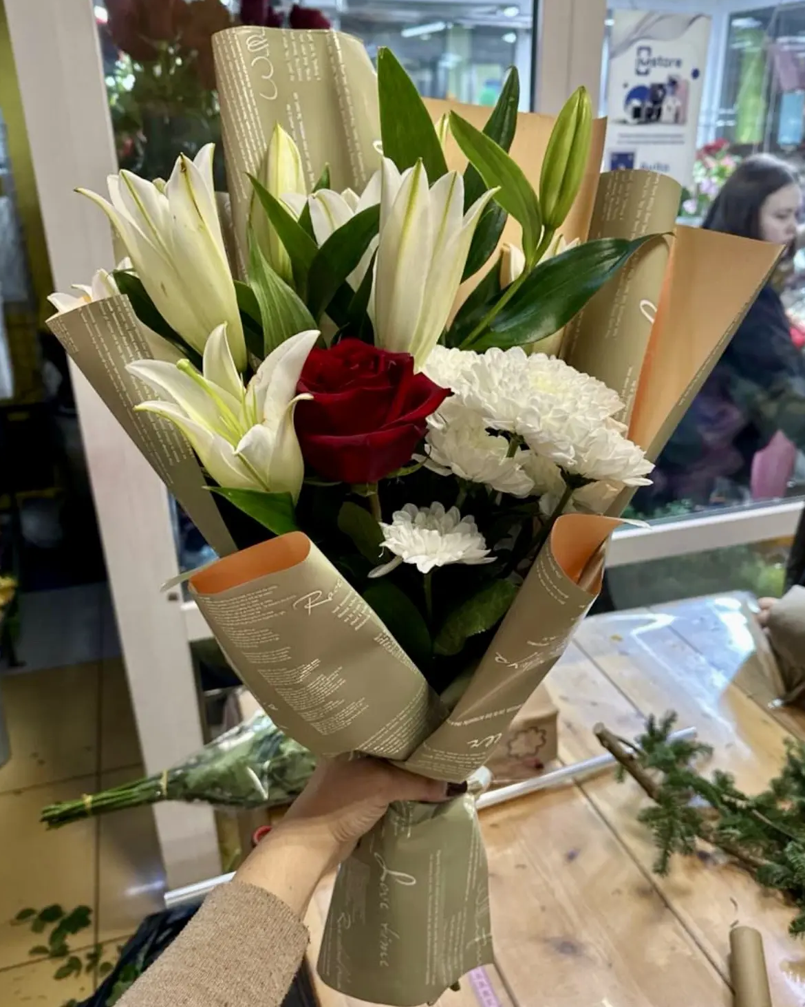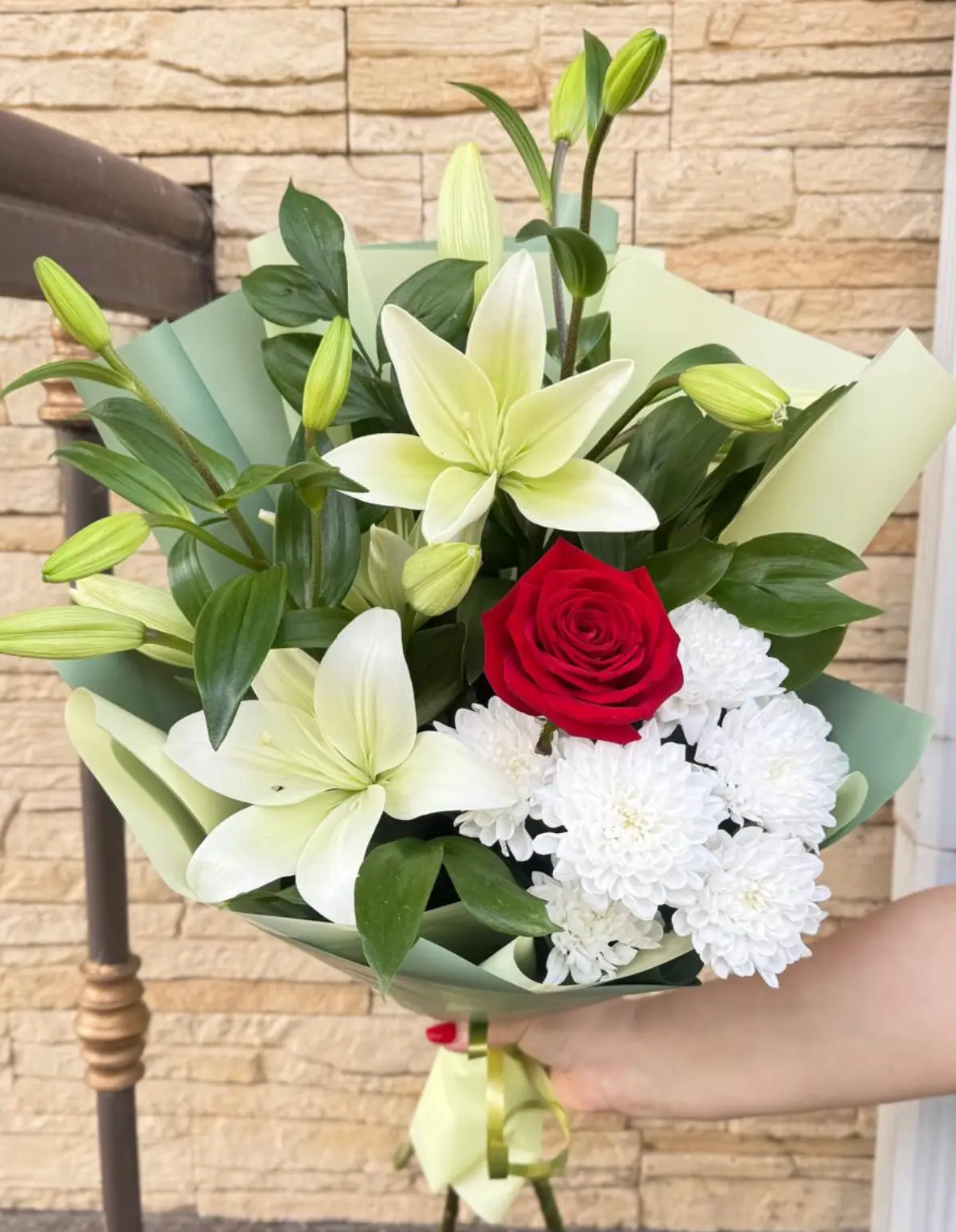 Лилии, роза, кустовая хризантема, упаковка, лента
