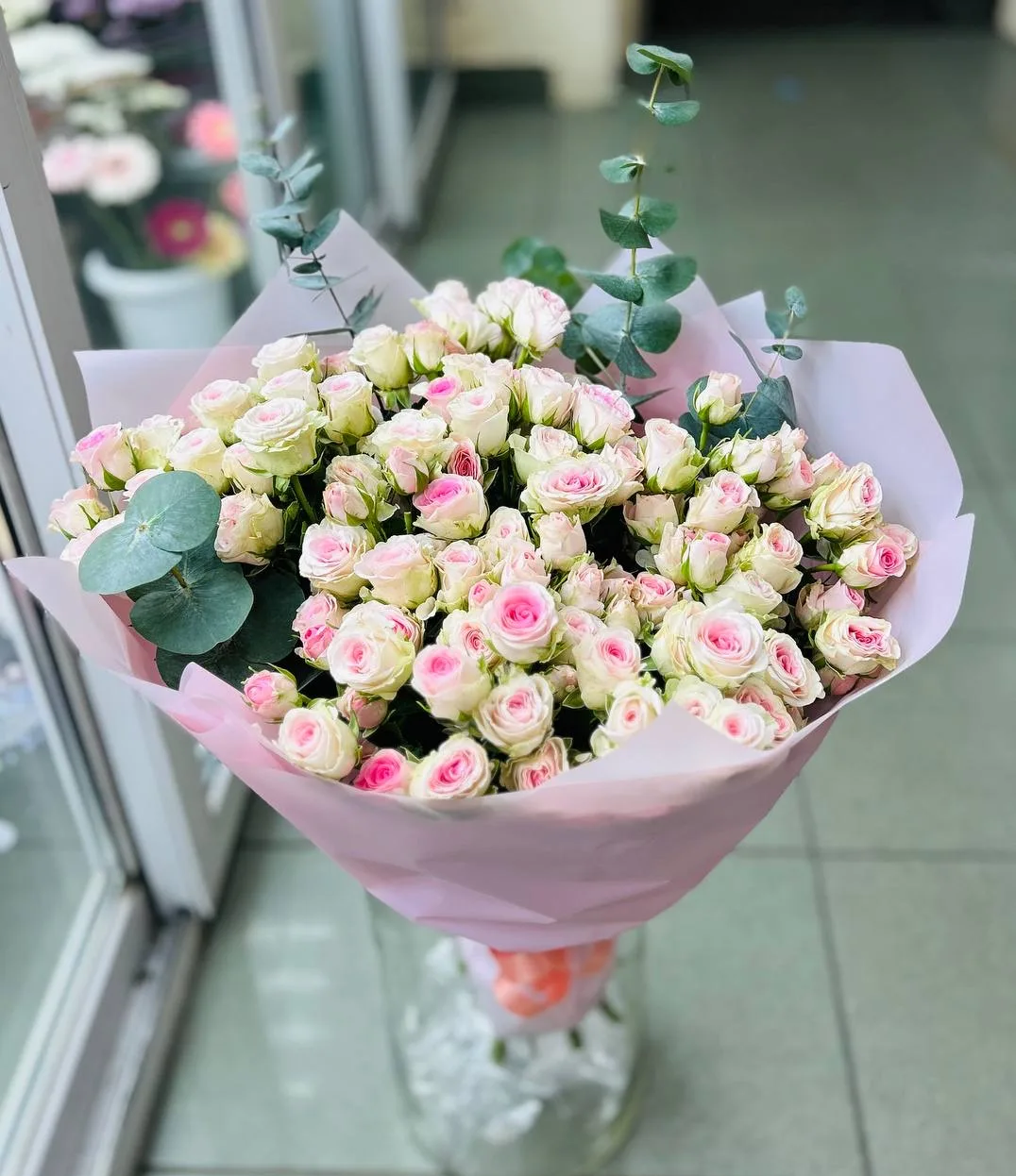 Состав букета : кустовые розы, зелень, упаковка,лента