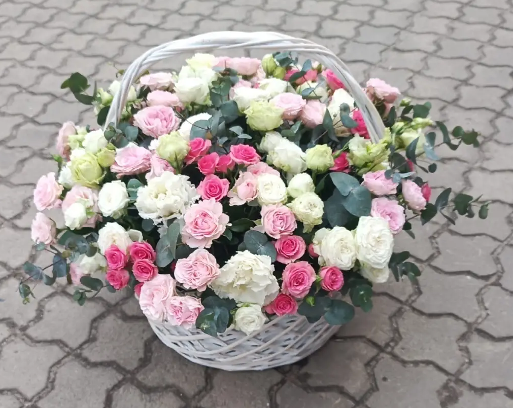 Кустовая роза, пионовидная роза, эустома, эвкалипт, корзина, лента