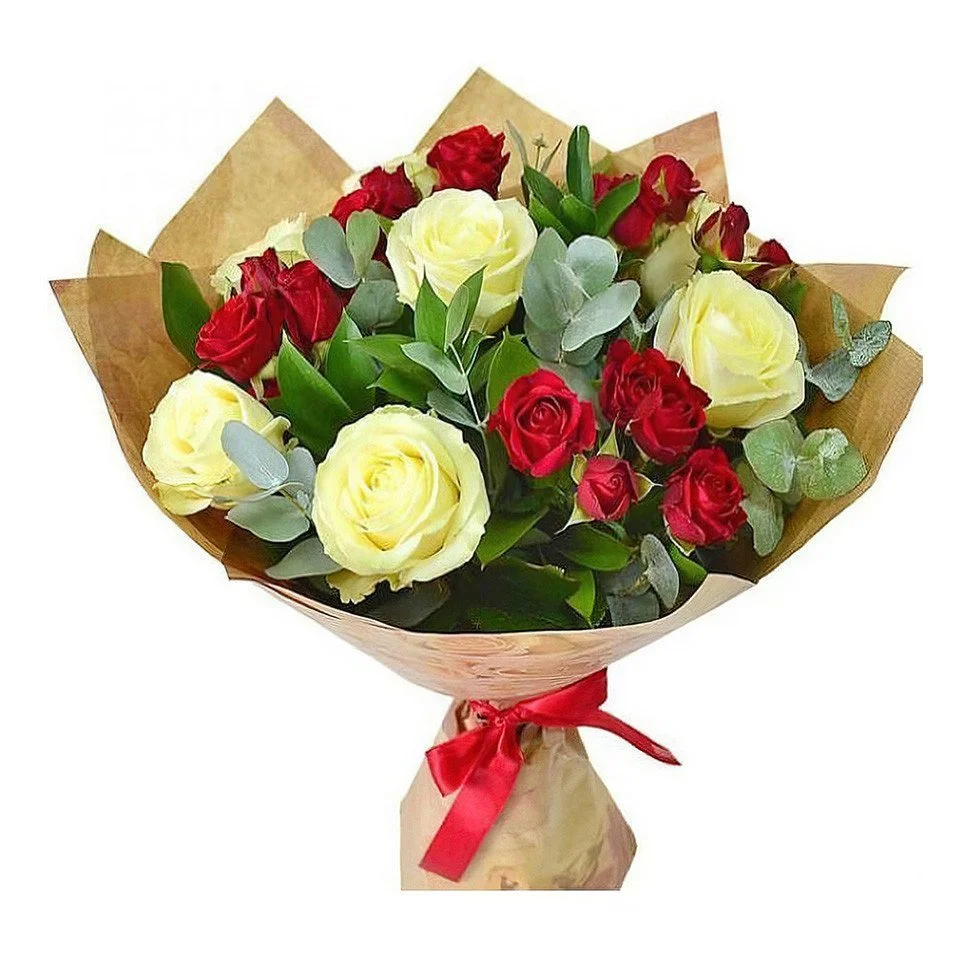 - Средний - роза - 7 шт., роза кустовая - 4 шт., зелень, упаковка, лента