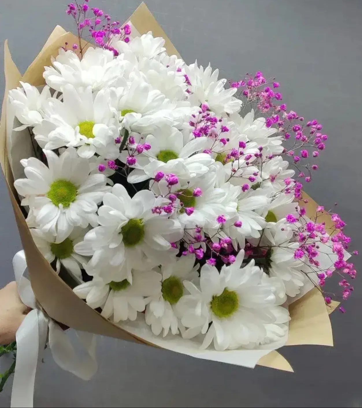 кустовая хризантема-5шт, гипсофила,упаковка,лента |