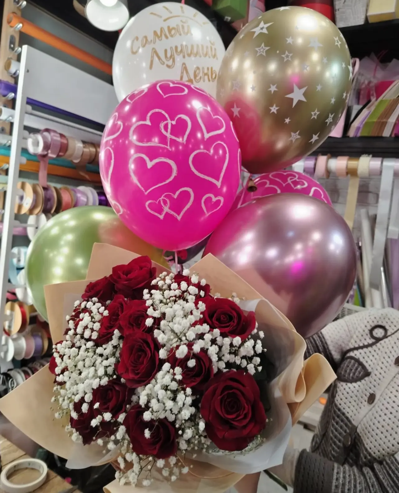 • Премиум - роза - 11 шт., гипсофила, упаковка, лента