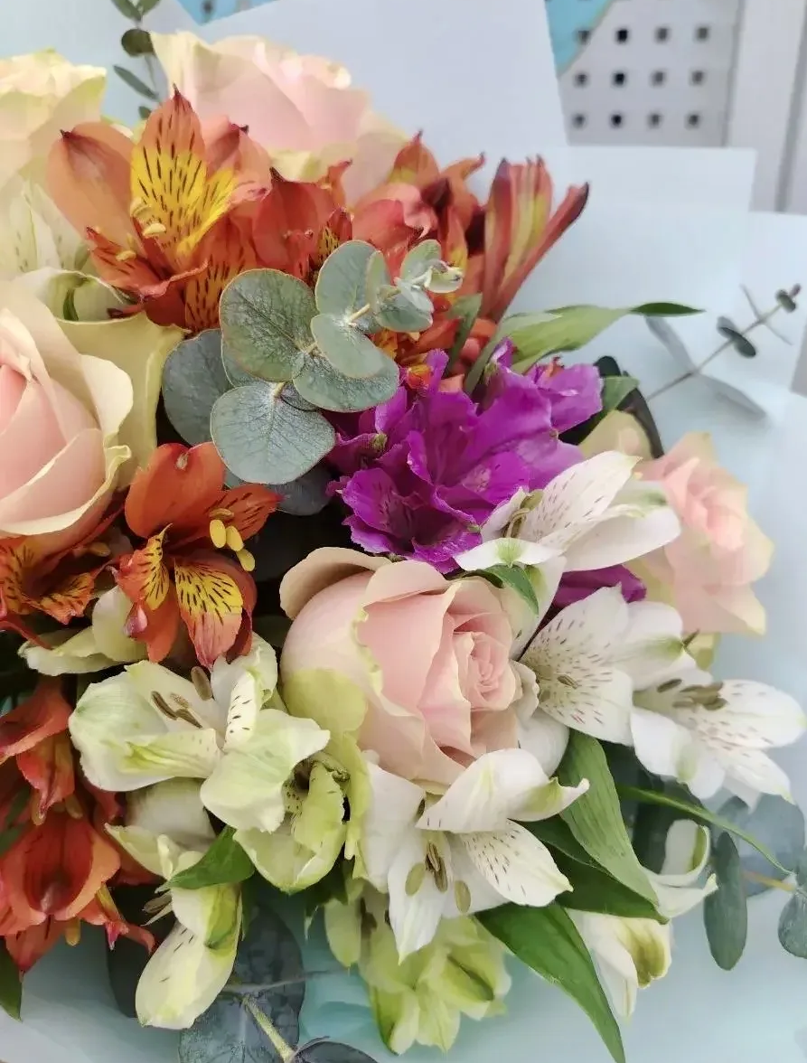 Нежный и в то же время яркий букет, в котором изящная нежно-розовая роза гармонично сочетается с белой, оранжевой и фиолетовой альстромерией. Такое сочетание оттенков создаёт живую и многогранную композицию, наполненную лёгкостью и настроением. Свежий эвкалипт добавляет букету природную утончённость и лёгкий аромат.