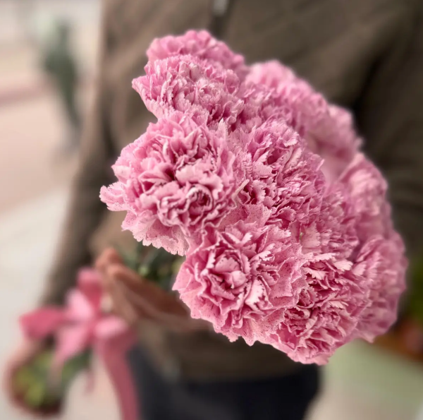 Нежный и утончённый букет из розовых гвоздик очаровывает своей лёгкостью и природной элегантностью. Мягкие оттенки лепестков создают атмосферу тепла, заботы и искренних чувств, делая композицию особенно трогательной и душевной.