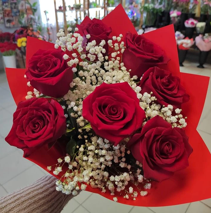 Букет из красных роз и белой гипсофилы — это воплощение элегантности и романтики. Яркие алые розы, символизирующие любовь и страсть, прекрасно контрастируют с нежными облачками белой гипсофилы, которые добавляют легкости и воздушности.