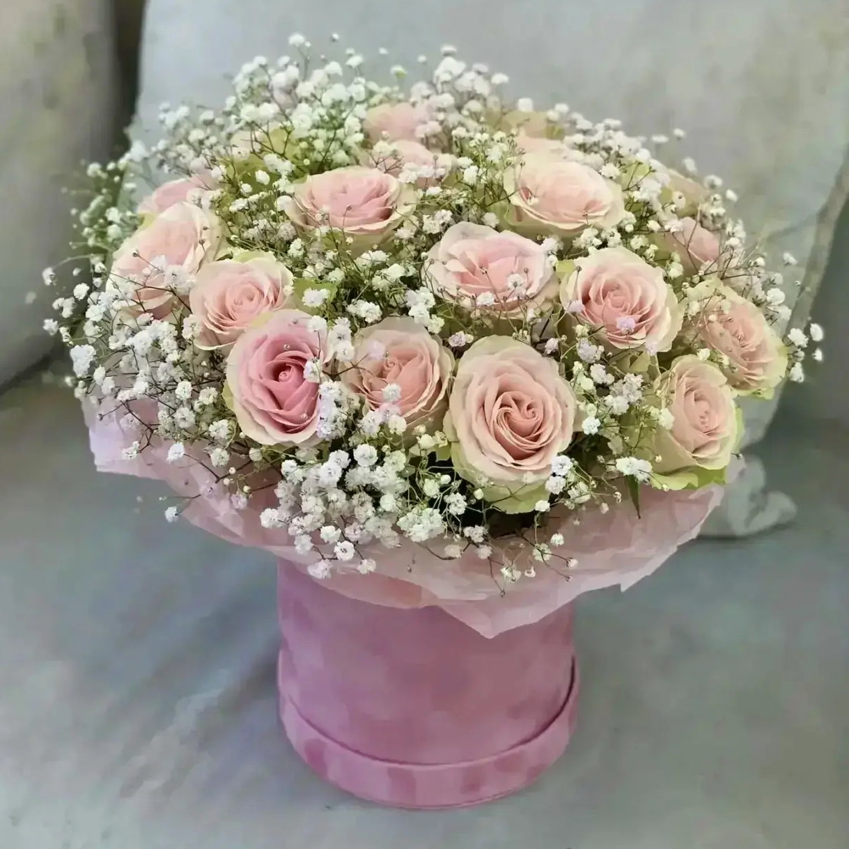 Нежная композиция в шляпной коробке с розовыми розами и белой гипсофилой - гармония утончённой классики и воздушной лёгкости. Бархатистые лепестки роз в мягком розовом оттенке символизируют искренние чувства и заботу, а белоснежная гипсофила, словно облако, придаёт букету объём и невесомость. Такое сочетание выглядит изысканно и романтично, а стильная коробка делает композицию удобной и эффектной для подарка. Идеальный выбор для особенных моментов, когда хочется выразить нежность без лишних слов.