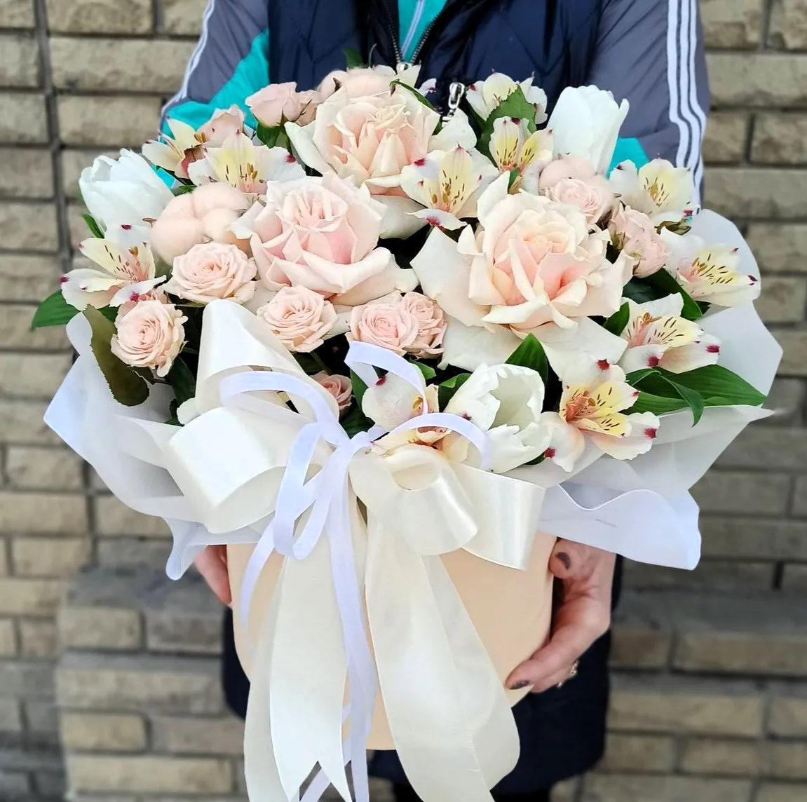- Стандарт - роза - 3 шт.,альстромерия - 7 шт., кустовая роза - 3 шт., зелень, оазис, шляпная коробка