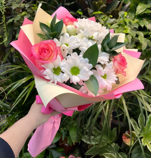 Нежный и в то же время выразительный букет, в котором изящная роза Джумилия с плавным переходом оттенков становится главным акцентом композиции. Её гармонично дополняют воздушная белая кустовая ромашковидная хризантема, кустовая роза, и свежая зелень, создавая объёмный и живой образ.