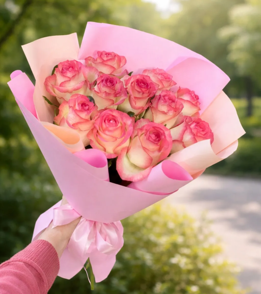 Изысканный букет из 11 роз «Джумилия» в стильной упаковке - воплощение нежности, утончённости и романтического настроения. Лепестки с мягким кремовым основанием и изящной розовой каймой создают эффект лёгкого акварельного перехода, делая каждую розу по-настоящему уникальной. Букет выглядит воздушно и элегантно, а аккуратная упаковка подчёркивает его изысканный характер и современный стиль. Такой подарок идеально подойдёт для признаний, комплиментов и особенных моментов, наполненных чувствами.