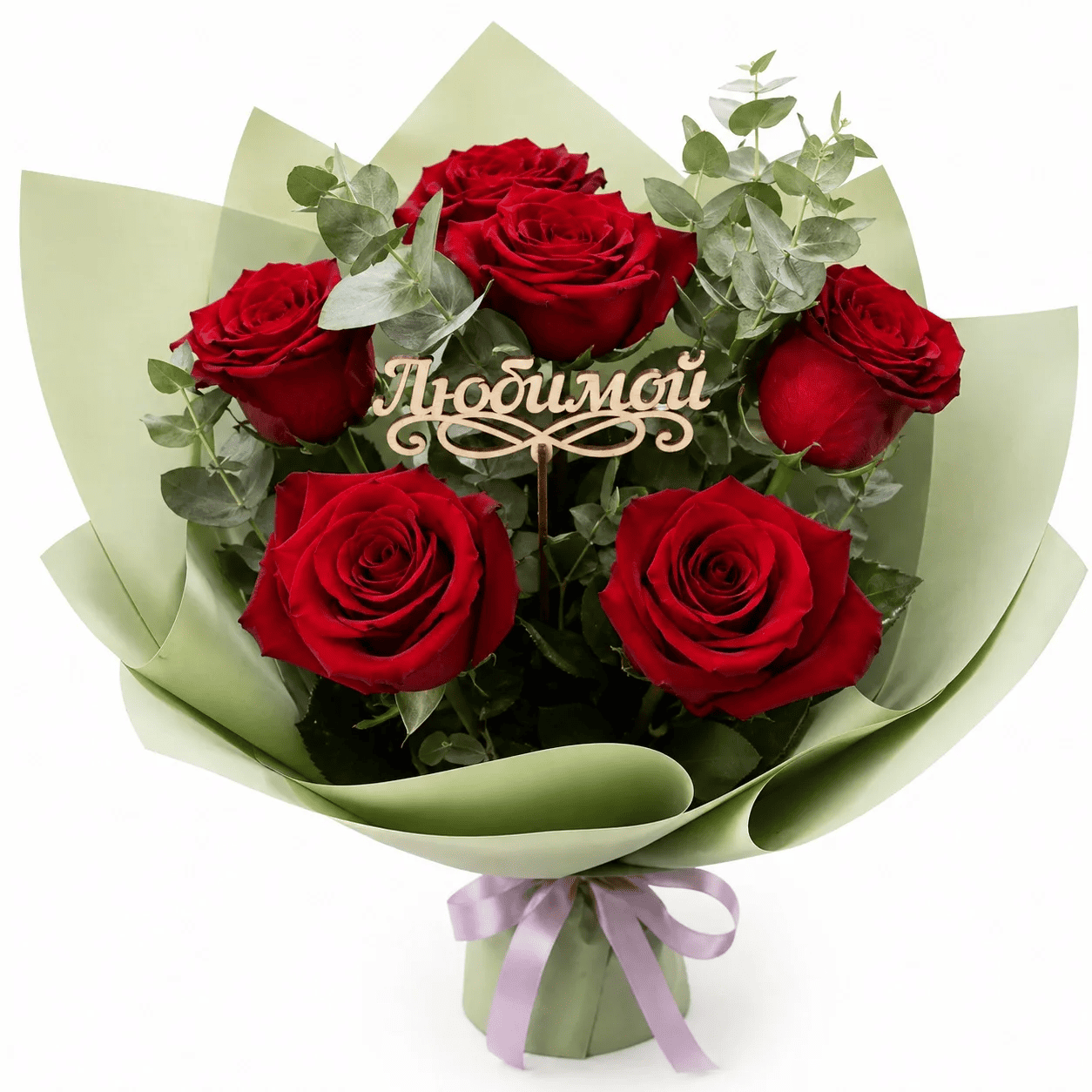 Топпер «Любимой» делает подарок максимально личным и эмоциональным, подчёркивая адресность и особый смысл букета. Аккуратная упаковка завершает композицию, придавая ей элегантный и праздничный вид.