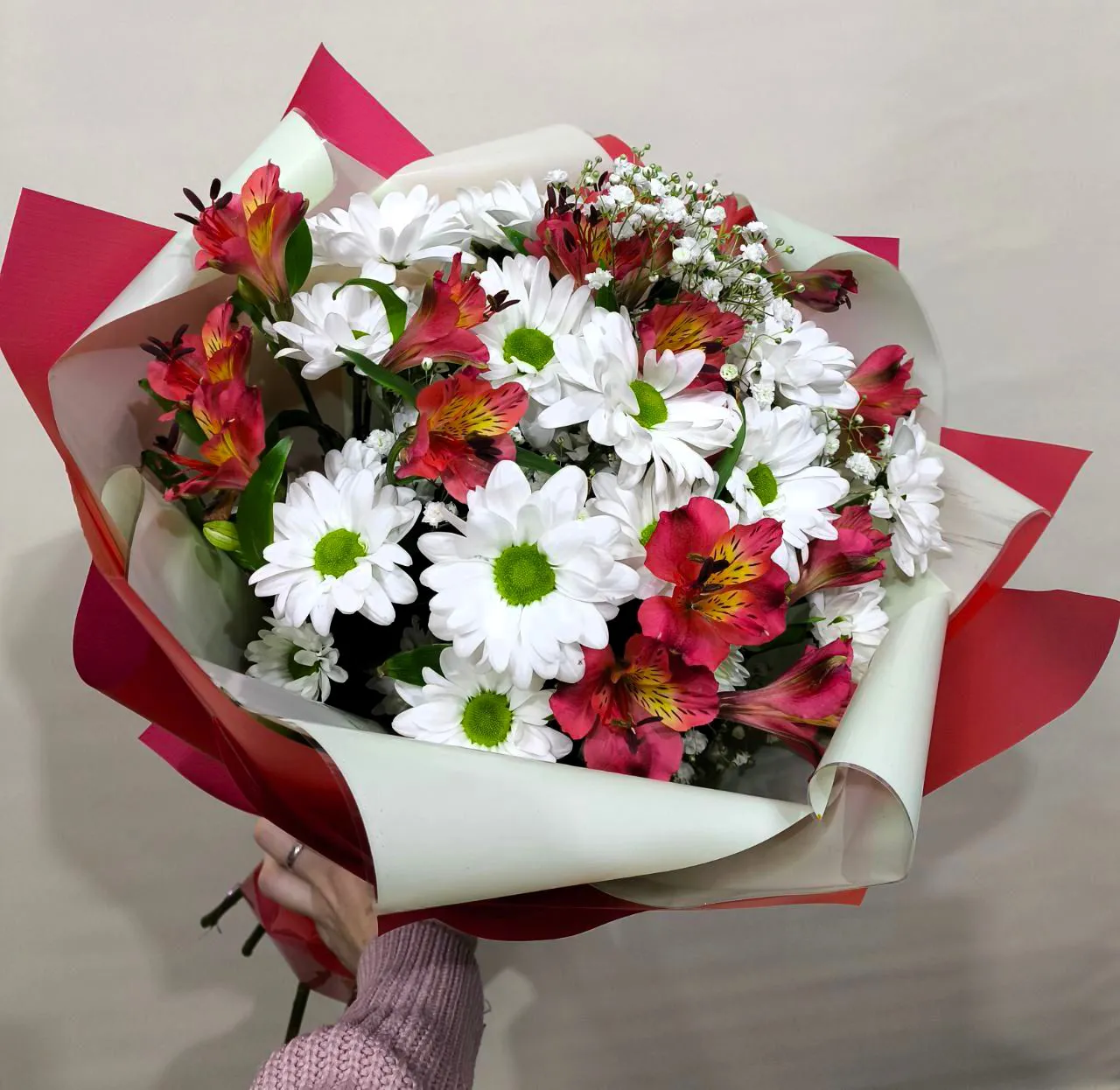 Нежный шепот альстромерий, словно бабочки, порхающие над пышными облаками кустовых хризантем. В этом букете - сама весна, с ее легкостью, свежестью и бесконечным очарованием.