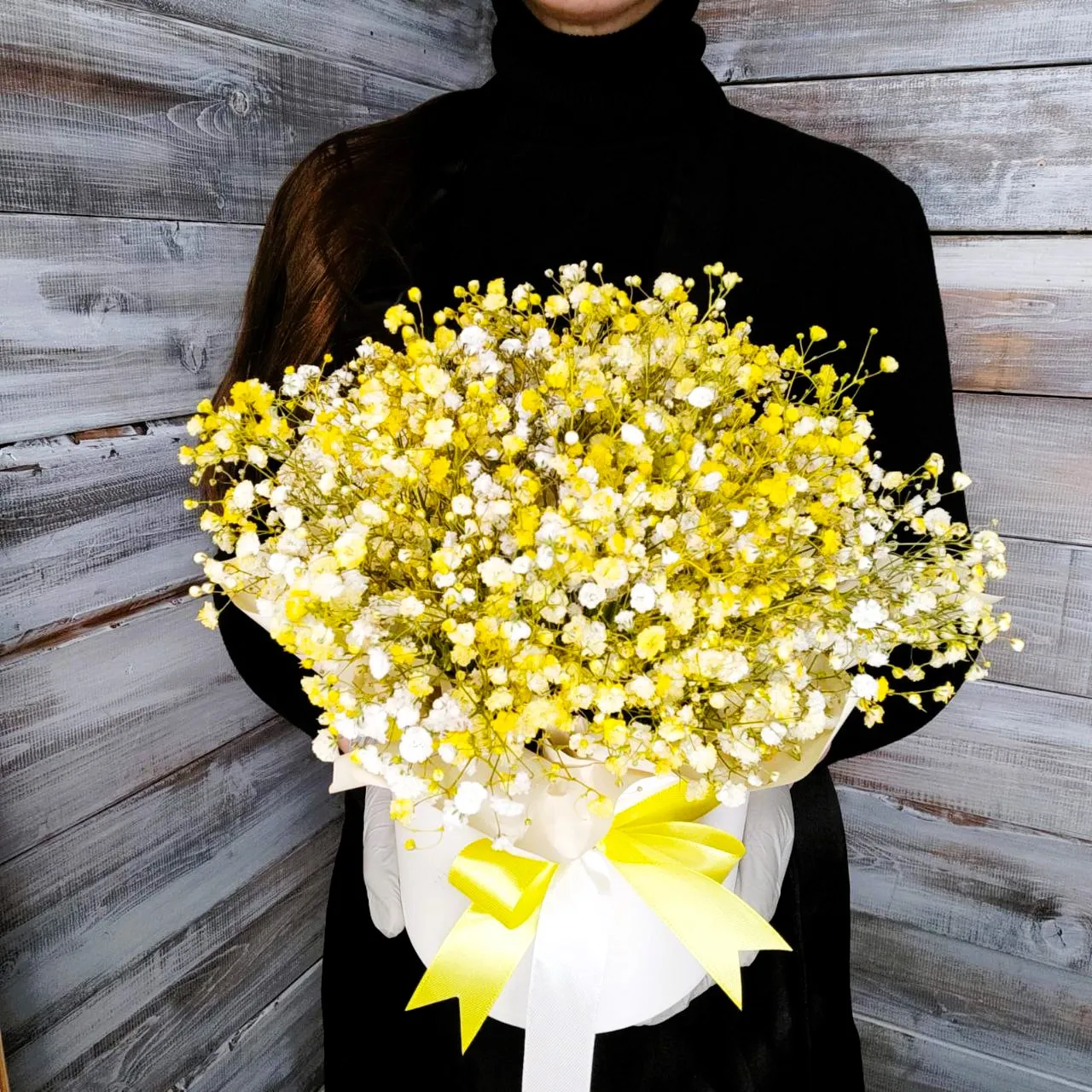 Желтая гипсофила символизирует радость и дружбу, что делает её отличным выбором для подарка близким. Шляпная коробка, аккуратно оформленная и обогащенная зеленью, подчеркнет изящество этих цветов и станет стильным акцентом в любом уголке вашего дома или офиса.