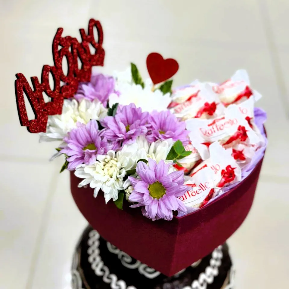 С такой шляпной коробкой с хризантемами и рафаэлло в виде сердца вы сможете порадовать кого угодно: девушку, маму, подругу или любого человека, которому хотите сделать приятное. Такой комплимент непременно запомнится надолго!