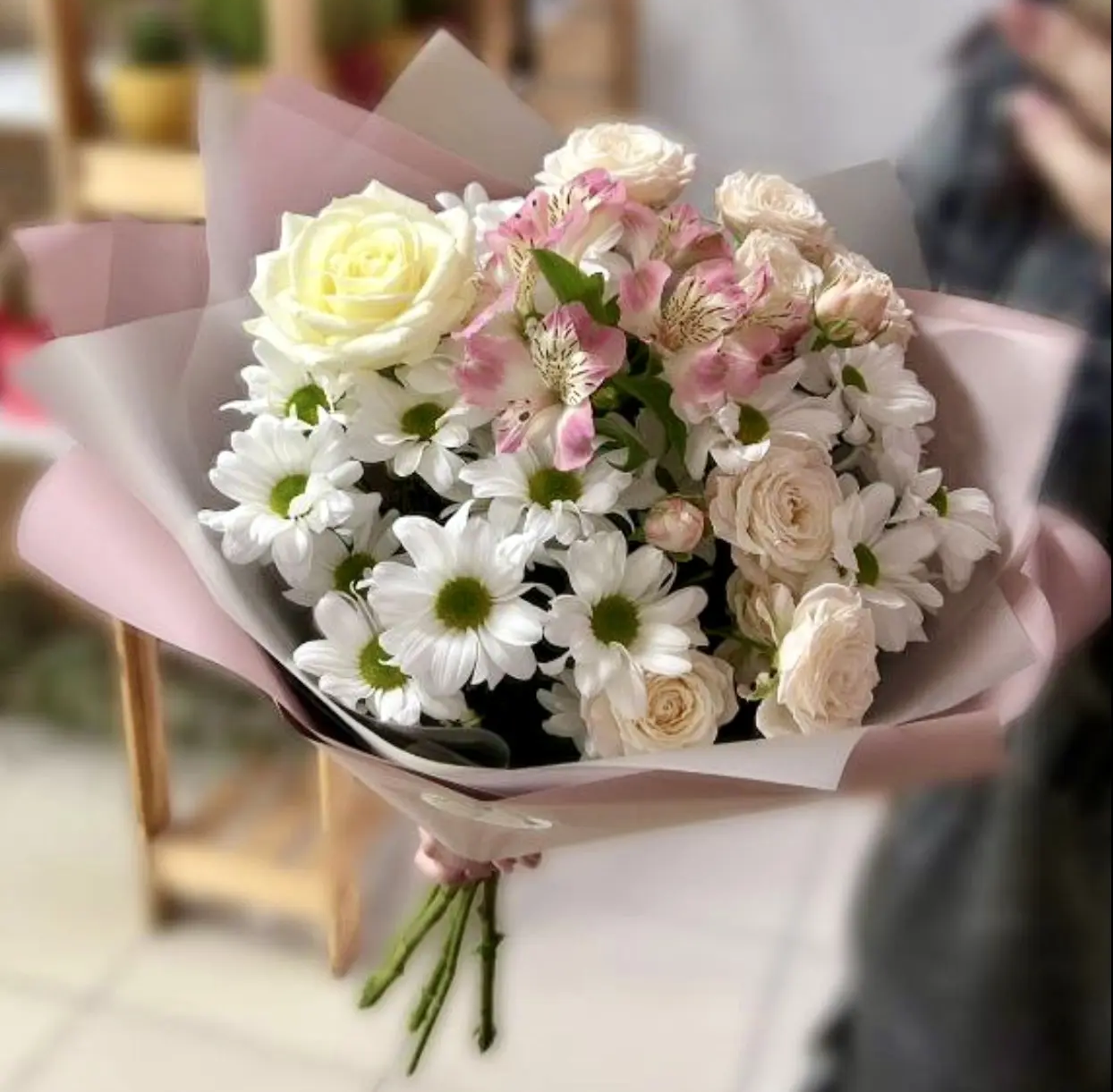 Утончённый и многослойный букет, в котором каждая деталь раскрывает свою красоту. Белая роза задаёт чистоту и элегантность, нежно-розовая альстромерия добавляет лёгкость и романтичное настроение, ромашковидная кустовая хризантема привносит естественность и уют, а бежевая кустовая роза завершает композицию мягкими, тёплыми оттенками.
