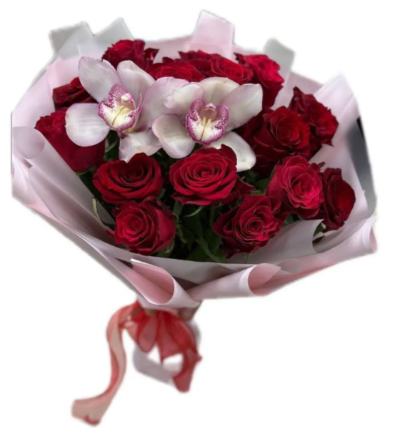 роза-15 шт, орхидея-2 шт, упаковка, лента