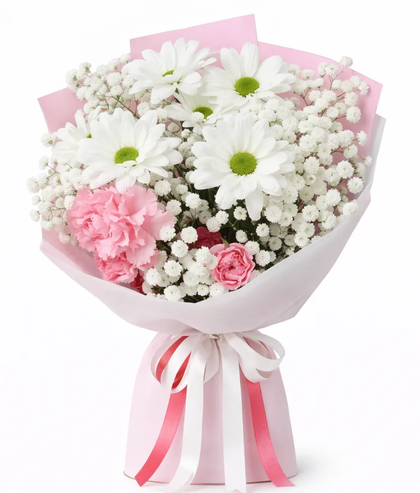 Нежный и воздушный букет, в котором мягкая розовая гвоздика придаёт композиции тепло и утончённость, ромашковидная кустовая хризантема добавляет лёгкость и естественную красоту, а гипсофила создаёт эффект невесомого облака. Такое сочетание цветов формирует гармоничный и трогательный образ, наполненный светлыми эмоциями.