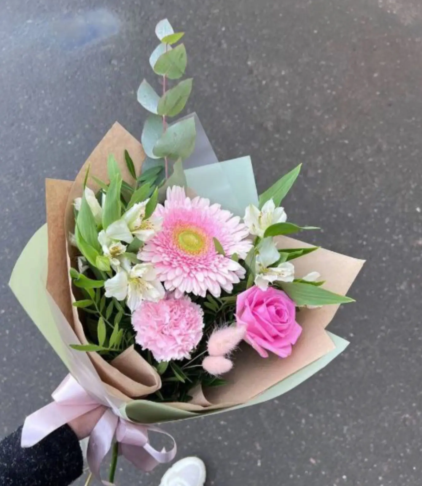 гербера-1шт, роза-1шт,гвоздика-1шт, алстромерия-2шт,зелень, упаковка, лента |