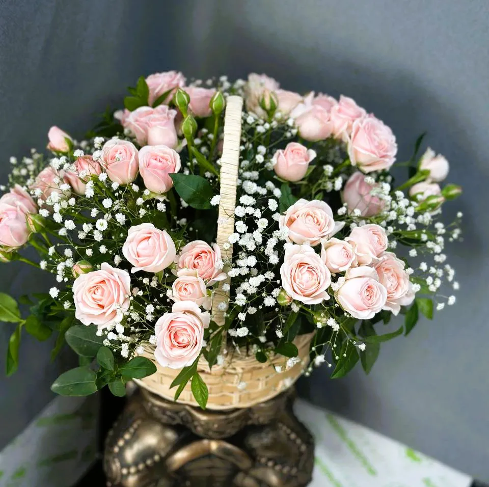 Корзина с розами и гипсофилой — это симфония нежности и элегантности, которая станет прекрасным подарком для любого повода.