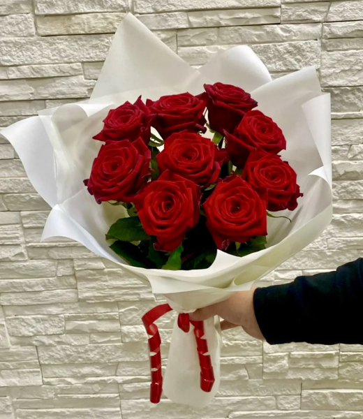 Эффектный букет из 9 красных роз в стильной упаковке - выразительный символ любви, страсти и глубоких чувств.