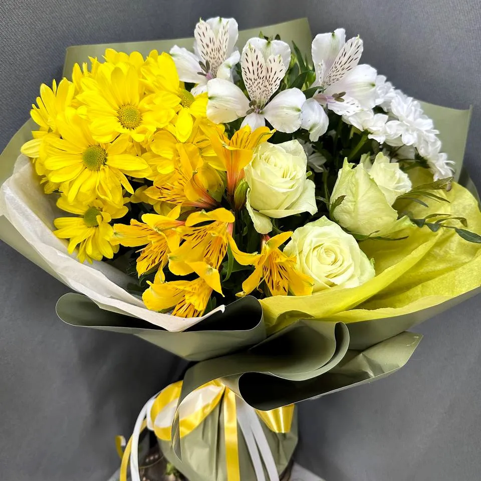 - Премиум - роза - 5 шт., хризантема - 3 шт., альстромерия - 4 шт., упаковка, лента