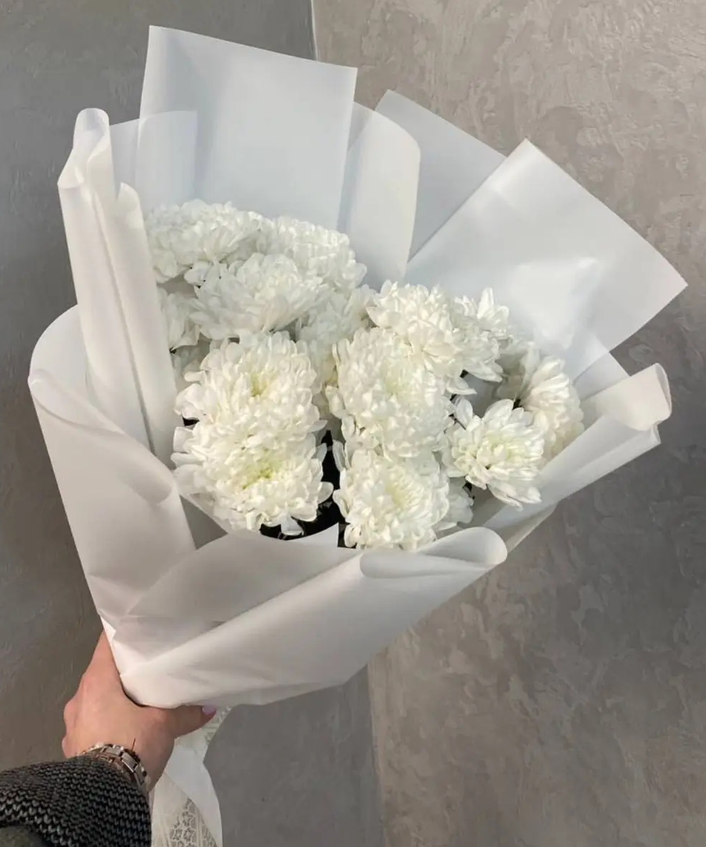 Элегантный букет из белой кустовой хризантемы в белой упаковке создаёт лёгкий и воздушный образ с эффектом естественной красоты. Стильно, нежно и универсально для любого повода.