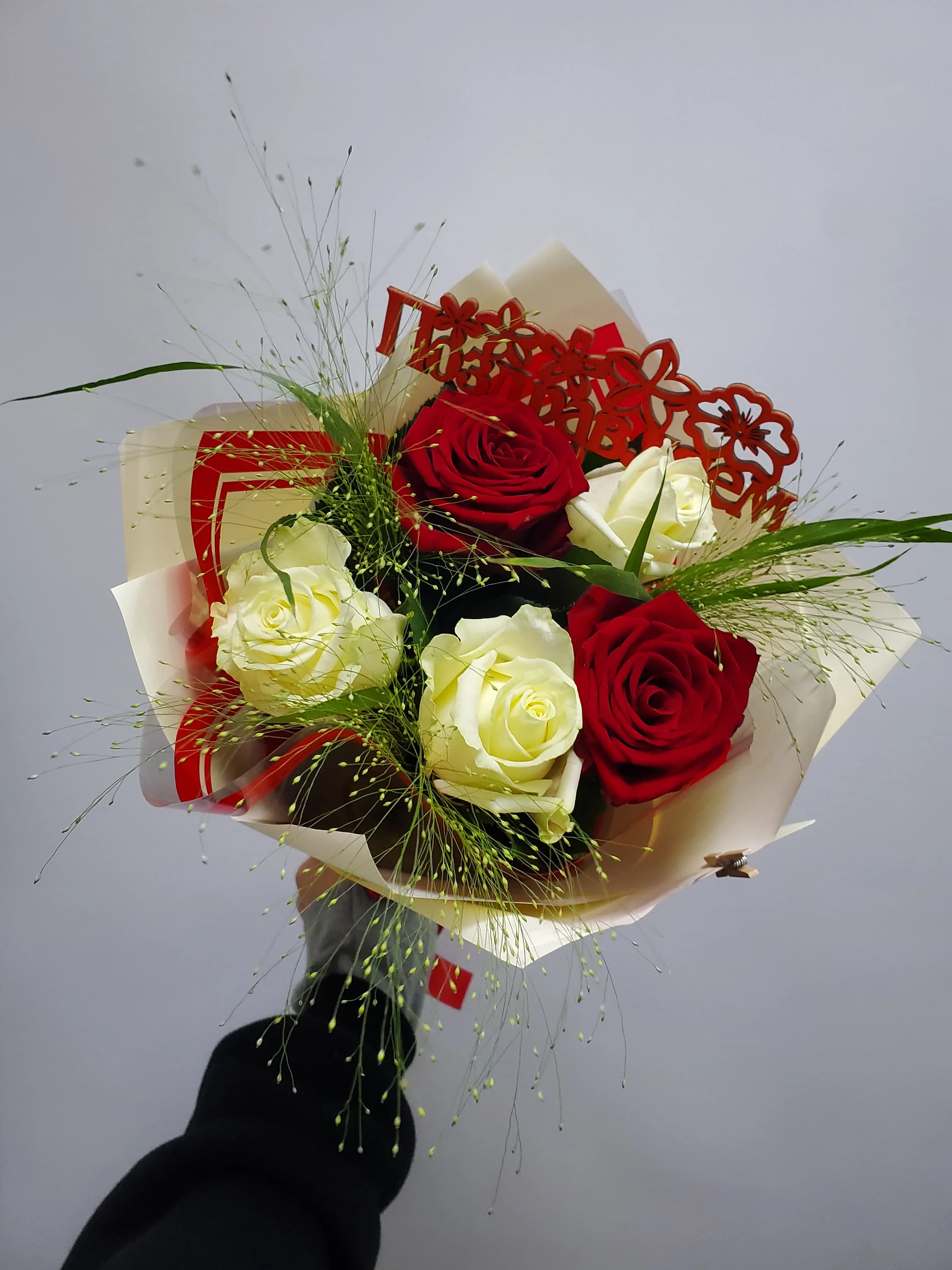 Роза красная и белая, зелень, упаковка, топпер, лента