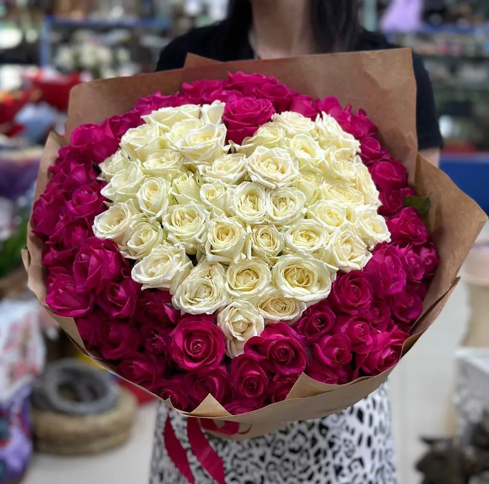 Этот великолепный букет из 101 белой и розовой розы в форме сердца – идеальное воплощение любви и нежности. Каждая роза, нежная и свежая, будто пропитана теплом чувств и искренностью намерений. Белые розы, символизирующие чистоту и уважение, изящно соседствуют с розовыми, олицетворяющими нежность и романтику.
